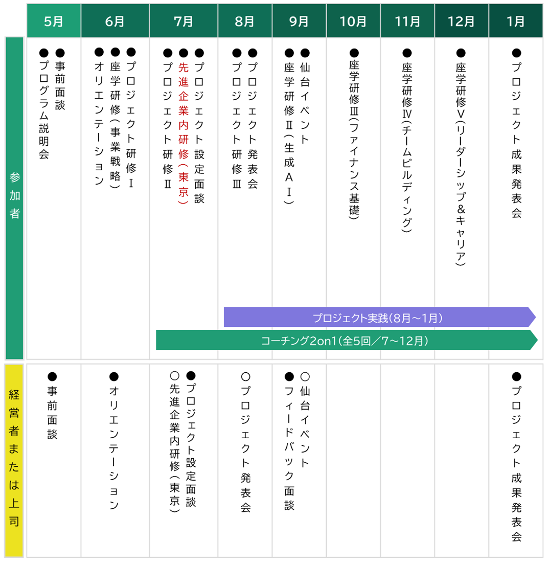 仙台都市圏(※)に所在している企業に勤め、自社の新規または既存プロジェクトを担当している(もしくは今後担当する予定がある)リーダーまたはリーダー候補(主に20代後半〜40代前半) ※所属企業からの推薦が必要
